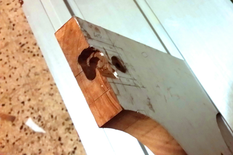 Un errore terribile è occorso durante la realizzazione dell'asola per alloggiamento del tirante della slitta. La fresatrice è sfuggita di mano e si è mangiato un bel po di legno.