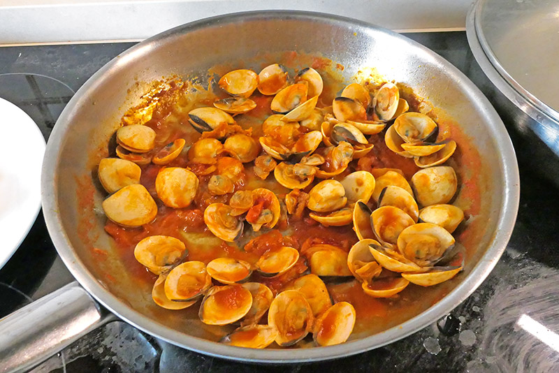 - Versare le vongole con il guscio ancora surgelate e aspettate che si aprano tutte, togliete una parte delle valve e quelle chiuse, aggiungere quelle sgusciate scongelate al microonde e schiaquate e cuocere per altri 10 min