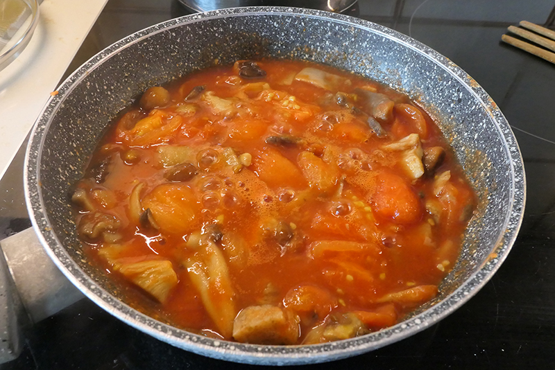 - In un tegame versare i pomodori tagliati a metà, i funghi, l'aglio, un cucchiaio di passata di pomodoro, un po di acqua, sale, pepe e peperoncino. Far cuocere fino ad appassire i pomodori.