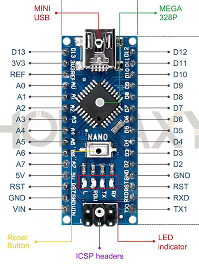 - A6 - A7: Questi pin sono anch'essi analogici, ma sono meno comunemente usati perché la loro funzionalità principale è la lettura analogica. Su alcune versioni del Nano, A6 e A7 sono pin di ingresso analogico, ma non sono sempre facilmente accessibili o utilizzati.